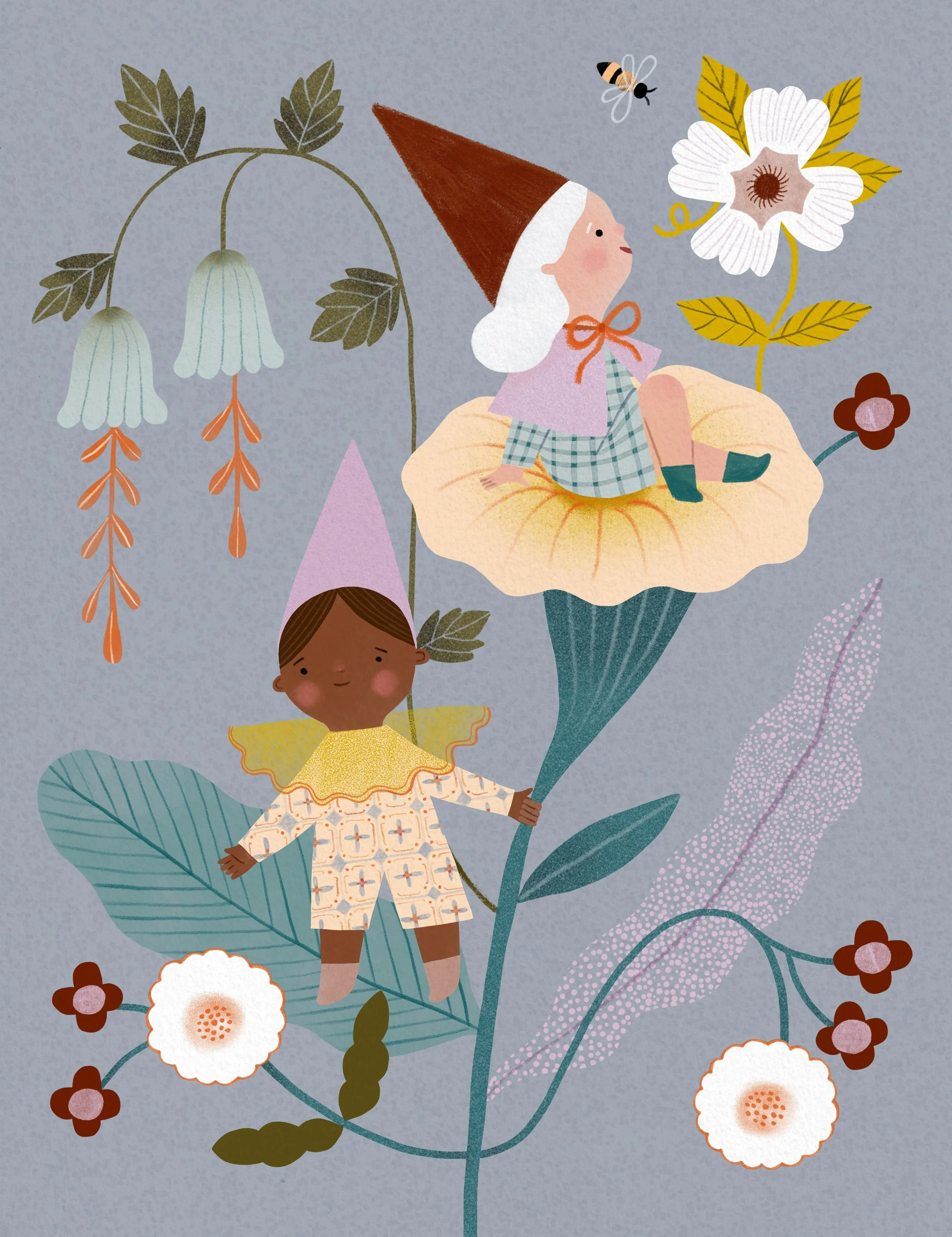 Inspired by nature and fairytales, it portrays two tiny enchanted beings exploring a world of oversized flowers and foliage.
