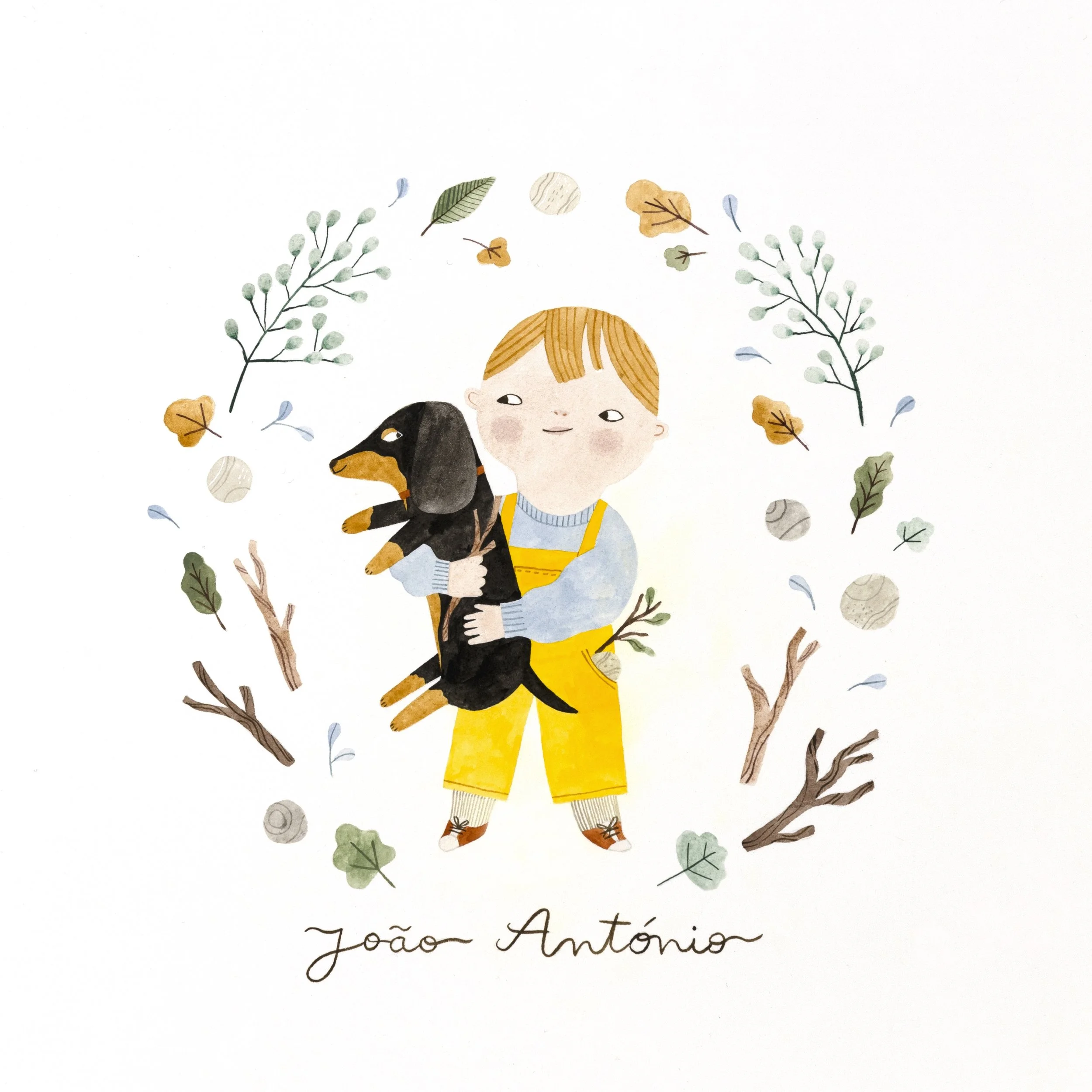 This hand-painted watercolor portrait captures a sweet moment between my nephew João António and his beloved dog, Balu. I included sticks and stones in the composition- his favorite things to collect and play with- adding a playful and personal touch to the scene. The illustration is a celebration of his curious spirit and the quiet joy of childhood companionship.